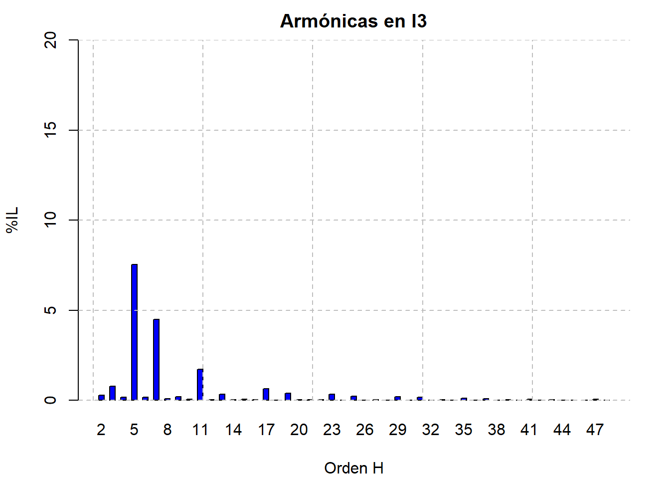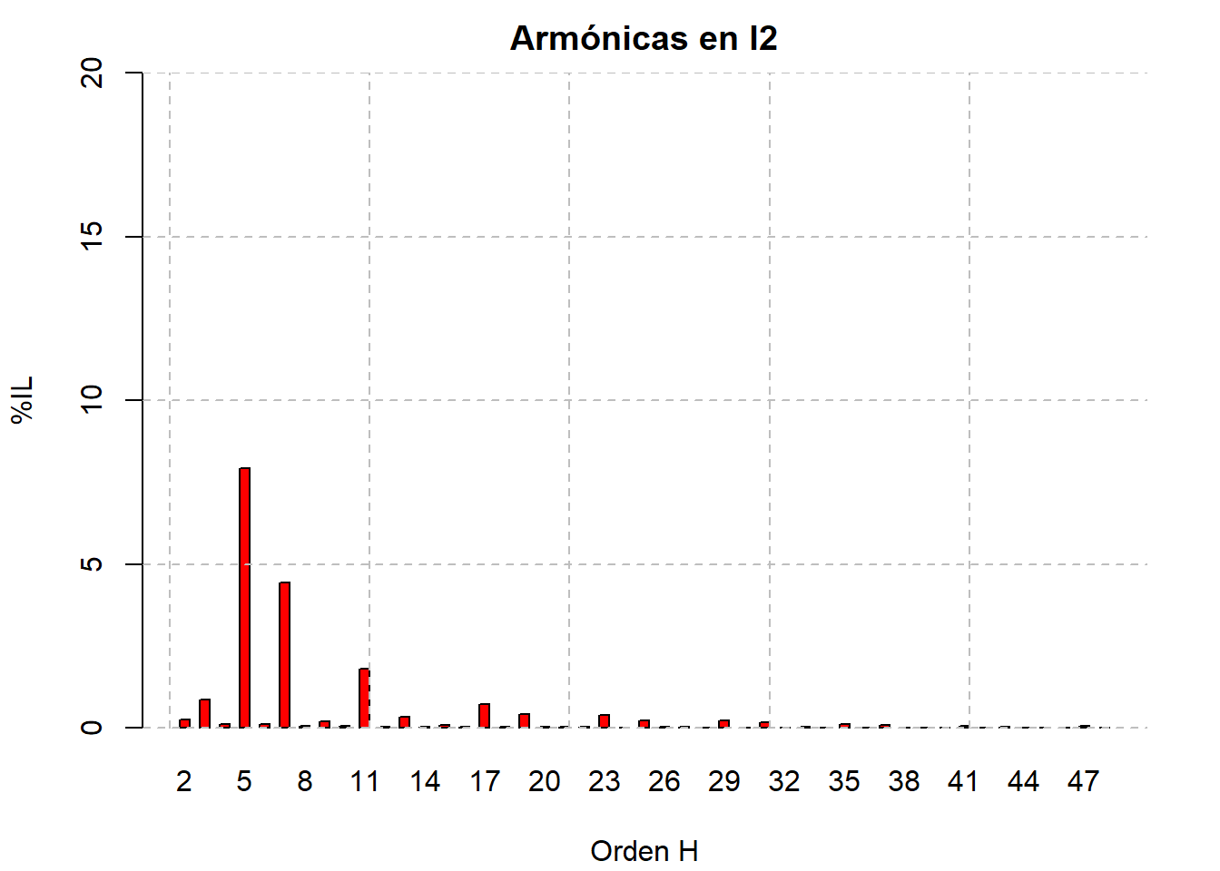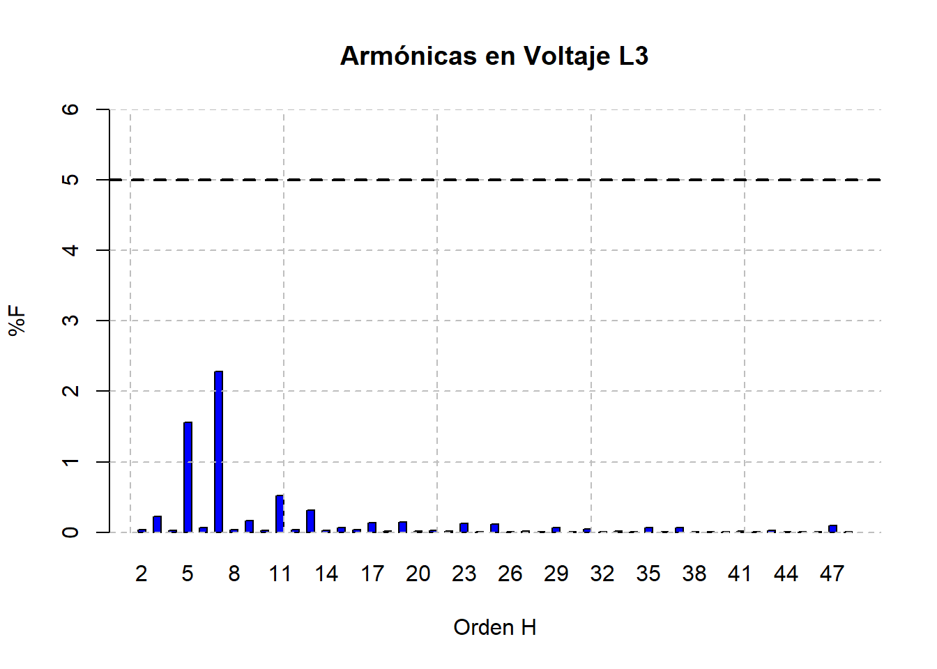 - El comportamiento de las armónicas de la corriente sigue un comportamiento normal, donde la armónica 5ª es la de mayor magnitud, seguida de la 7ª y 11ª. Por otro lado, las armónicas de la tensión siguen un comportamiento diferente, donde la armónica 7ª es la de mayor valor, seguido de la 5ª y 11ª, esto puede indicar una posible resonancia en la armónica 7ª. Es importante verificar esta frecuencia de resonancia entre el transformador y los elementos capacitivos conectados en su secundario. Este fenómeno se observa desde el mes pasado.